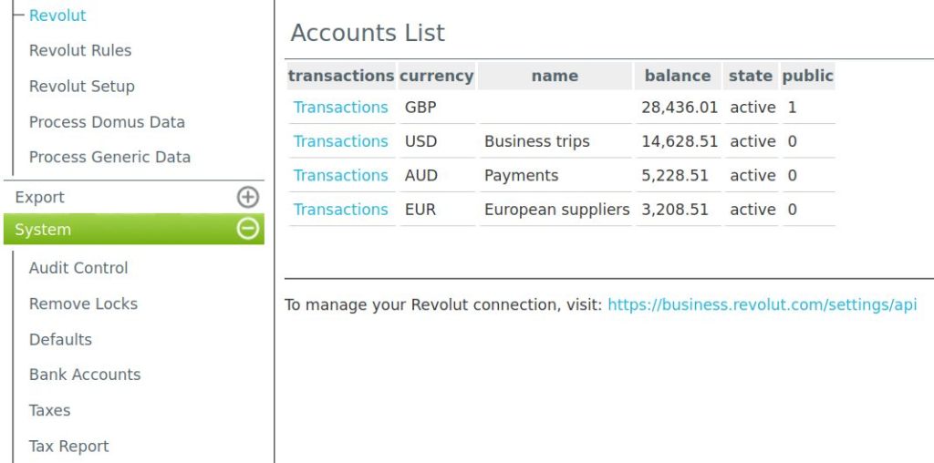 Our revolut module allows your to integrate and import transactions from your Revolut bank account into GL transactions This module also a rules engine where you can create rules based on meta data of existing transactions. Once rules are created all future transaction imports are debited/credited into correct accounts saving you the time to do the accounting for these transactions.